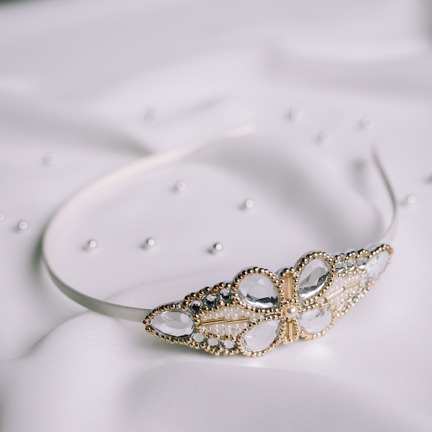 "The one who believed in miracles" is extremely elegant headband with a symmetrical pattern of Eimass rhinestones and sparkling elements. Like all our pieces, this headband is fully handmade. Please, pay attention, that because of the design and because it is handmade there is no two identical items,it might slightly differ - which just makes it unique for your wedding day.